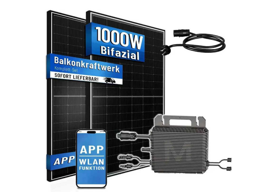 Wer nach einem Einsteiger-Balkonkraftwerk sucht, der bekommt derzeit bei Ebay ein Set bestehend aus zwei 500-Watt-Solarmodulen und einem Marken-Wechselrichter für richtig kleines Geld. Trotz des sehr günstigen Preises muss man nicht mit veralteter Technik oder B-Ware Vorlieb nehmen.